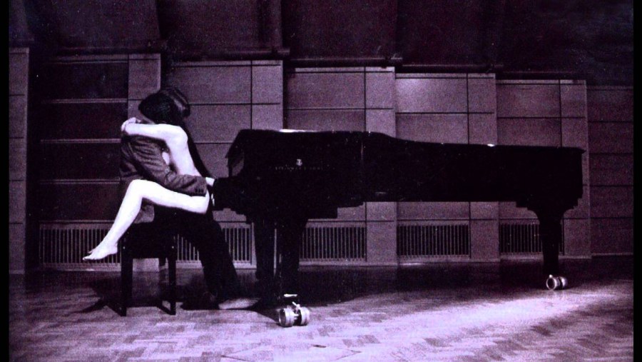 Slender White girl with tiny Titties strips naked at a Piano Bench models