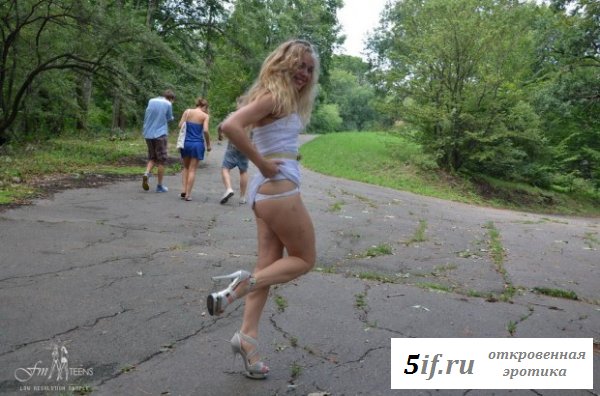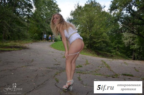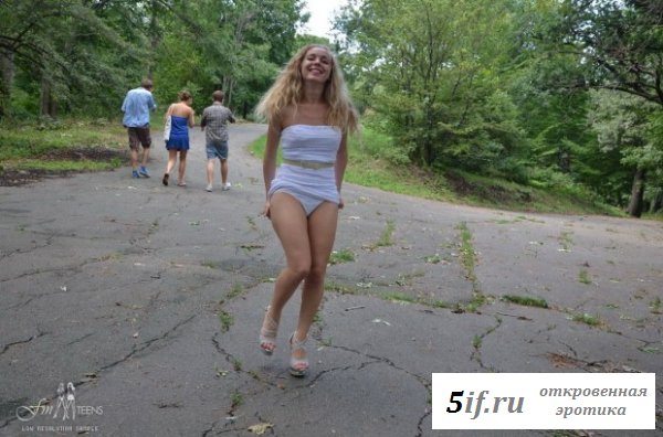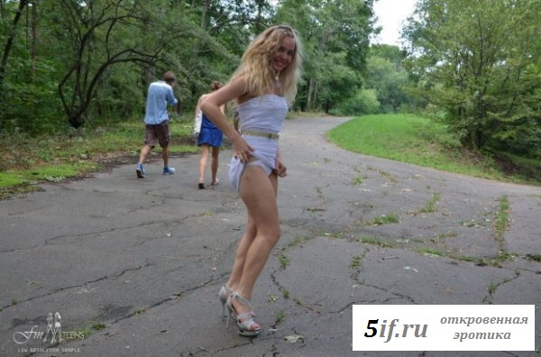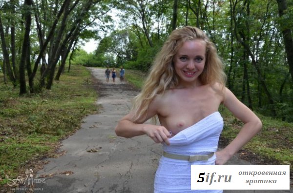 Услышав рассказы своей подруги, как она часто ходит по публичным местам совершенно голая, очень понравились блондинке. Вот и она решила становиться такой же, попросив подругу помочь ей в этом. Они пошли в парк и тёлка решила сначала оголить одну грудь и прилюдно снять из под короткого платья свои трусики, показав всем свою совершенную голую попочку. У сучки неплохо получается показывать свои прелести, пусть хоть и неловко со стеснением пока что это выходит. Совсем скоро она станет ещё одной натуралисткой.